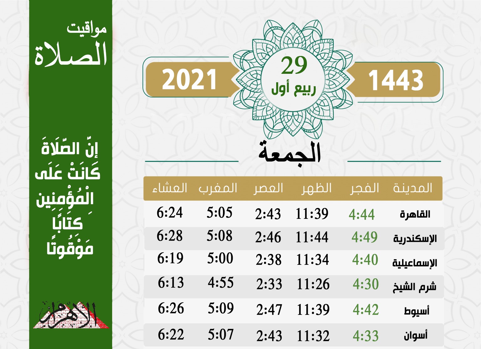 يحرص “اليوم السابع” على تقديم مواقيت الصلاة الصحيحة لقرائه الكرام في مختلف محافظات مصر، وذلك حرصًا على تسهيل معرفة مواعيد الفروض اليومية، وتشمل مواقيت الفجر، الشروق، الظهر، العصر، المغرب، والعشاء