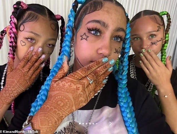 وخلال عطلة نهاية الأسبوع، نشرت نورث، البالغة من العمر 12 عامًا، عدة مقاطع فيديو عبر حسابها على تطبيق TikTok، ظهرت فيها بتسريحة ضفائر زرقاء طويلة وعدسات لاصقة باللون الأزرق، إضافة إلى شبكة سوداء تغطي أسنانها وحلقة أنف مزيفة، ما جعل مظهرها لافتًا وغير معتاد لطفلة في سنها.